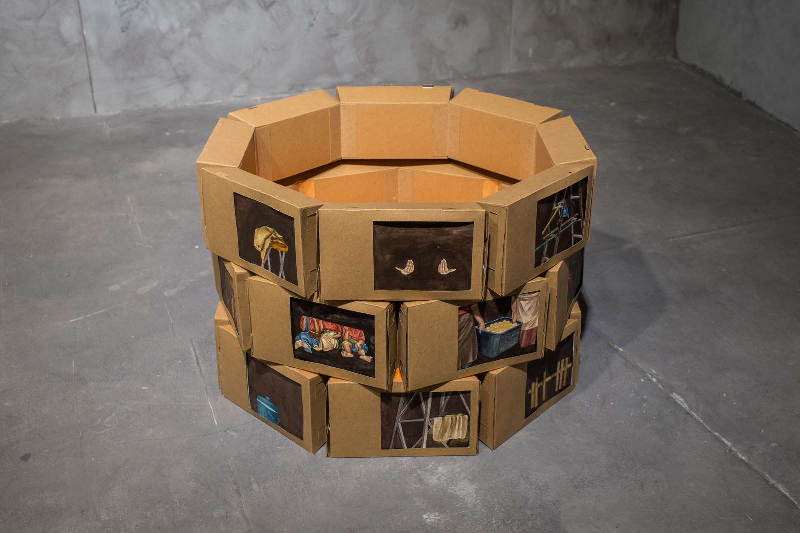 The outcome of Dian Suci’s documentation process is a work titled After Life: Everlasting Flame. The work incorporates food boxes used to package meals at Dapur Buruh Gendong. For Dian, the kitchen embodies the importance of a continuous cycle of aid. The artwork, shaped as a perpetually burning hearth, symbolizes the volunteers’ efforts as a network of mutual reinforcement. Small details within the work serve as visual records of the kitchen’s activities, illustrating how even the smallest acts of involvement contribute to the larger movement of people’s solidarity.