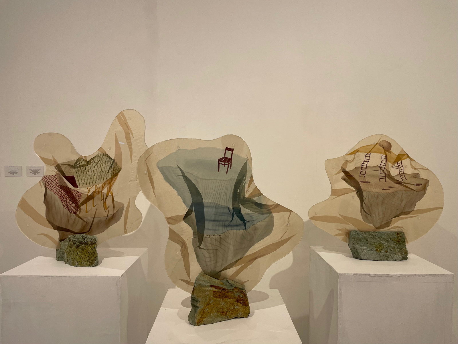 Acrylic on transparent fabric, acrylic sheets, stones