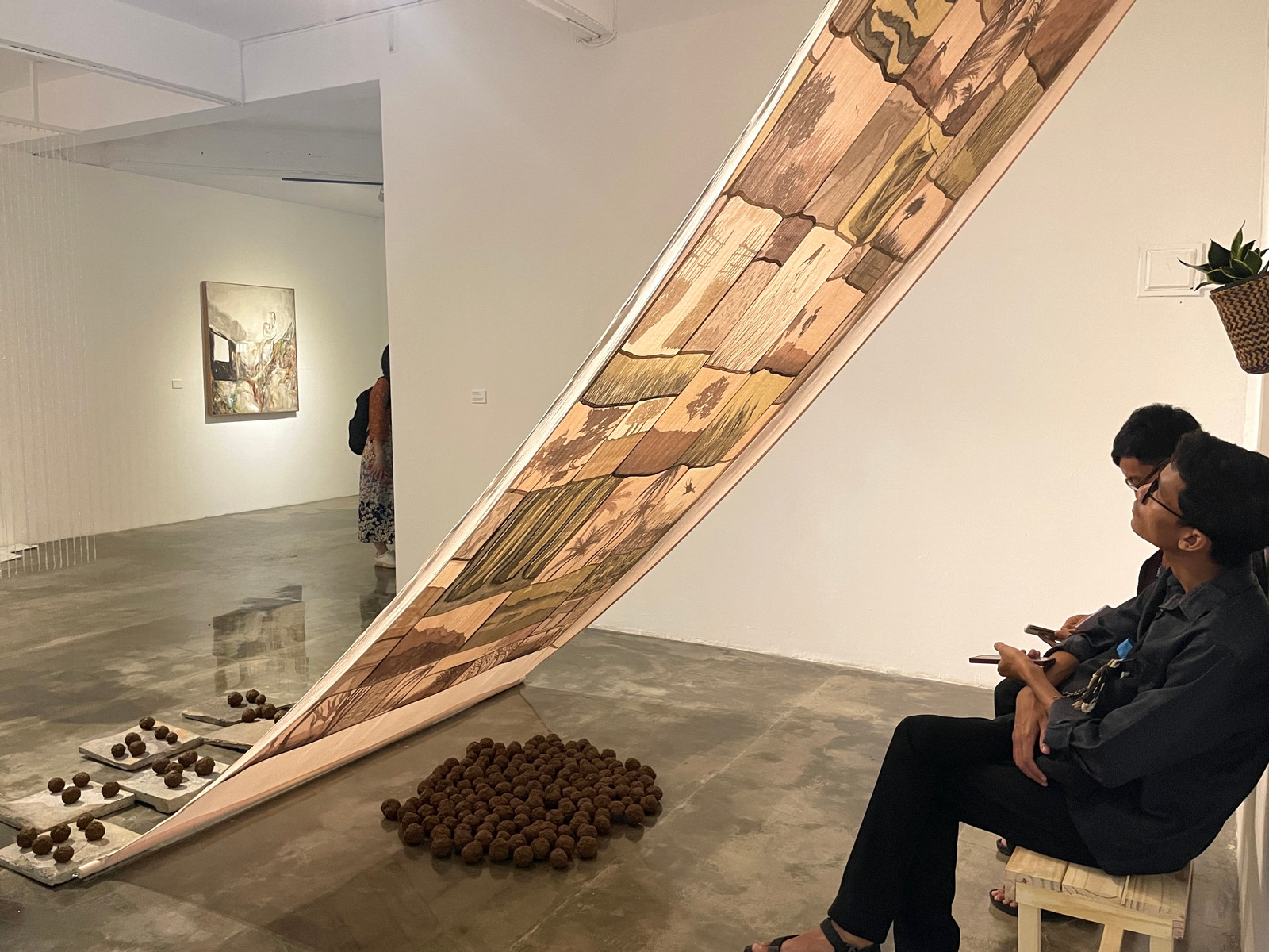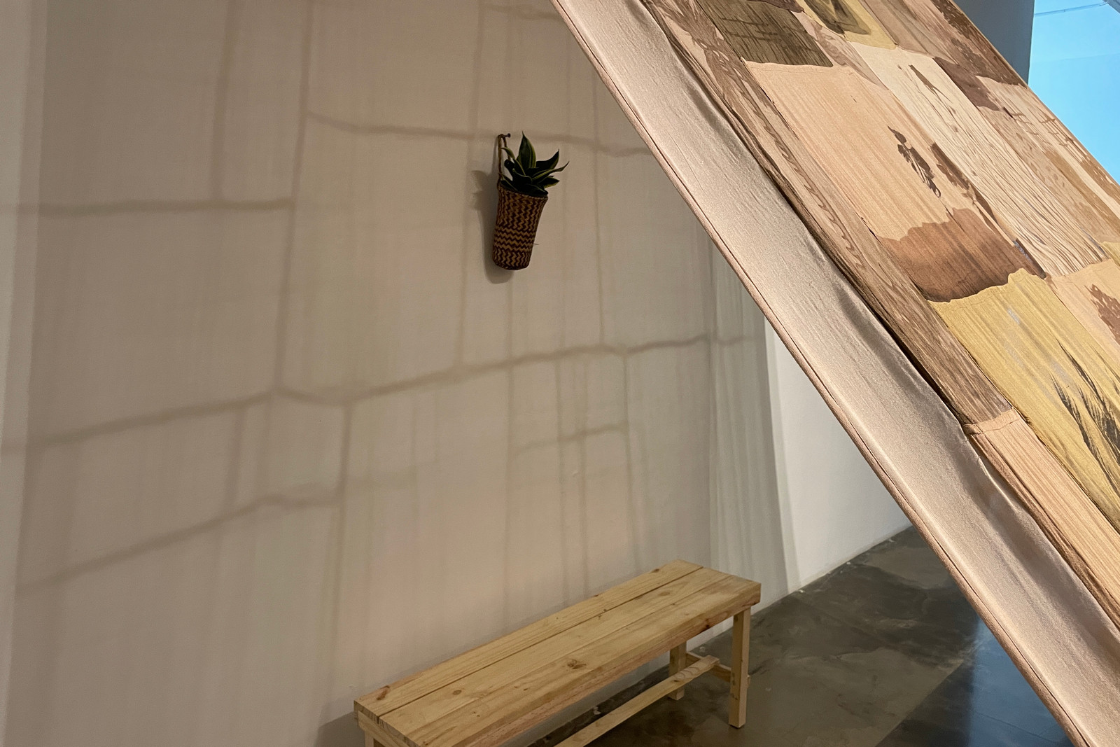 In its form, this work borrows the gesture of shelter, as if one could find shade beneath its shadow. It offers a space for listening, tending to conversations, and calling forth memories of home. Village landscapes — often seen in rural areas — are painted on semi-transparent fabric, evoking the haziness of memory. Mordant marks dyed with pigment from hedge plants lead us into a collective memory of the village, not as romantic nostalgia, but as fragments of meaning that continue to grow amidst the city. In urban kampungs, within the tightly linked housing blocks and the narrow lanes that separate them, traces of the villagers’ rural origins remain: murals of village scenes, birds in cages, and plants arranged vertically along the walls of the alleyways.