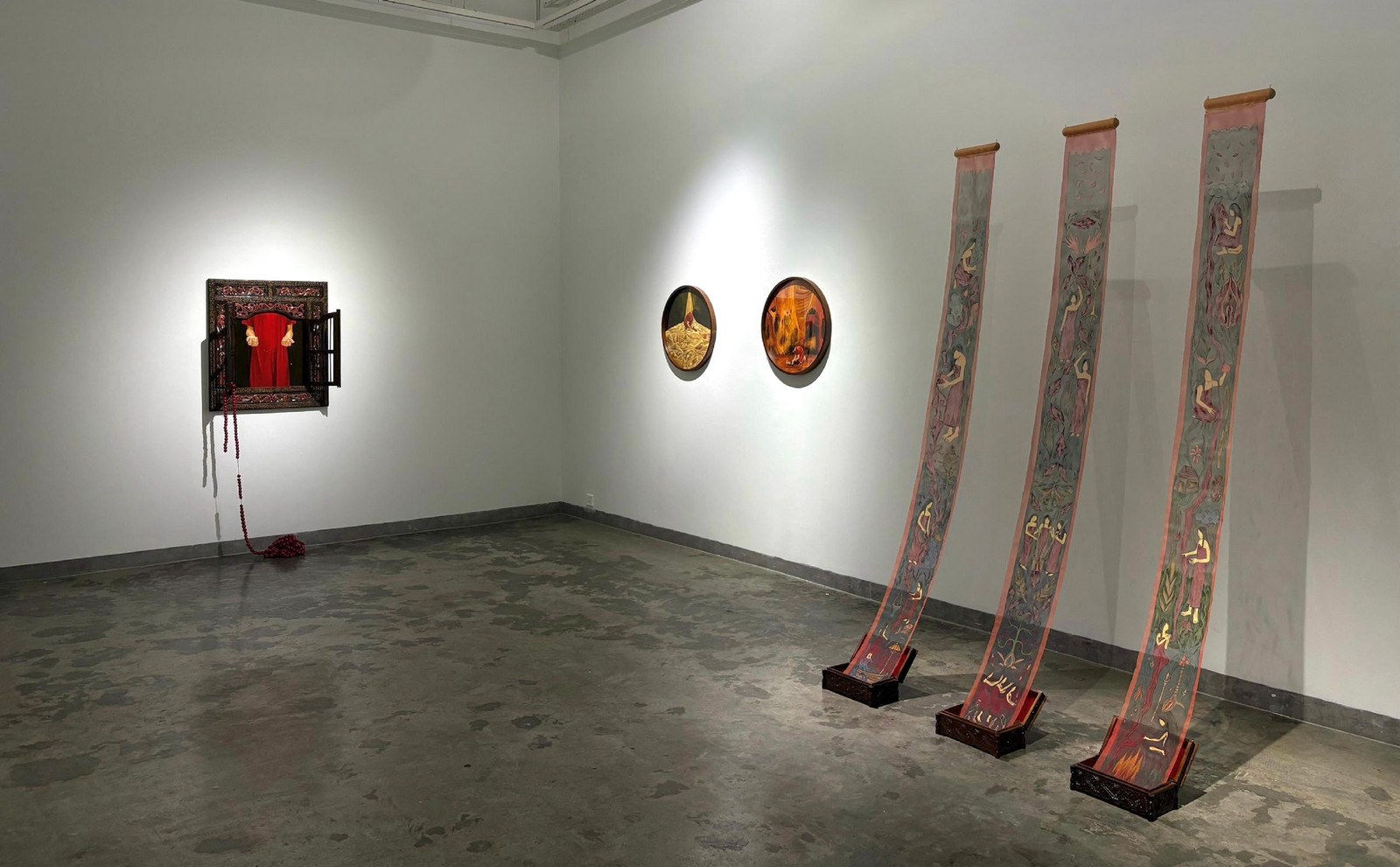 Oil on canvas, carved wooden window, wooden beads